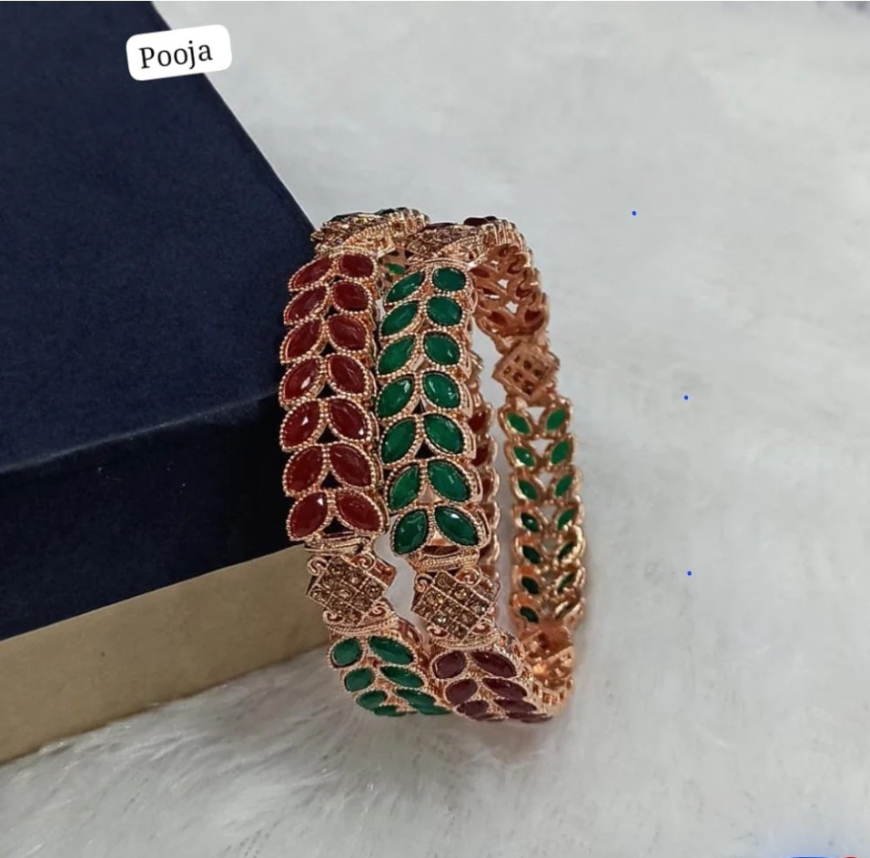 Gold Plated Pota Stone Bangles Set - Pink and Green - Size- 2.4