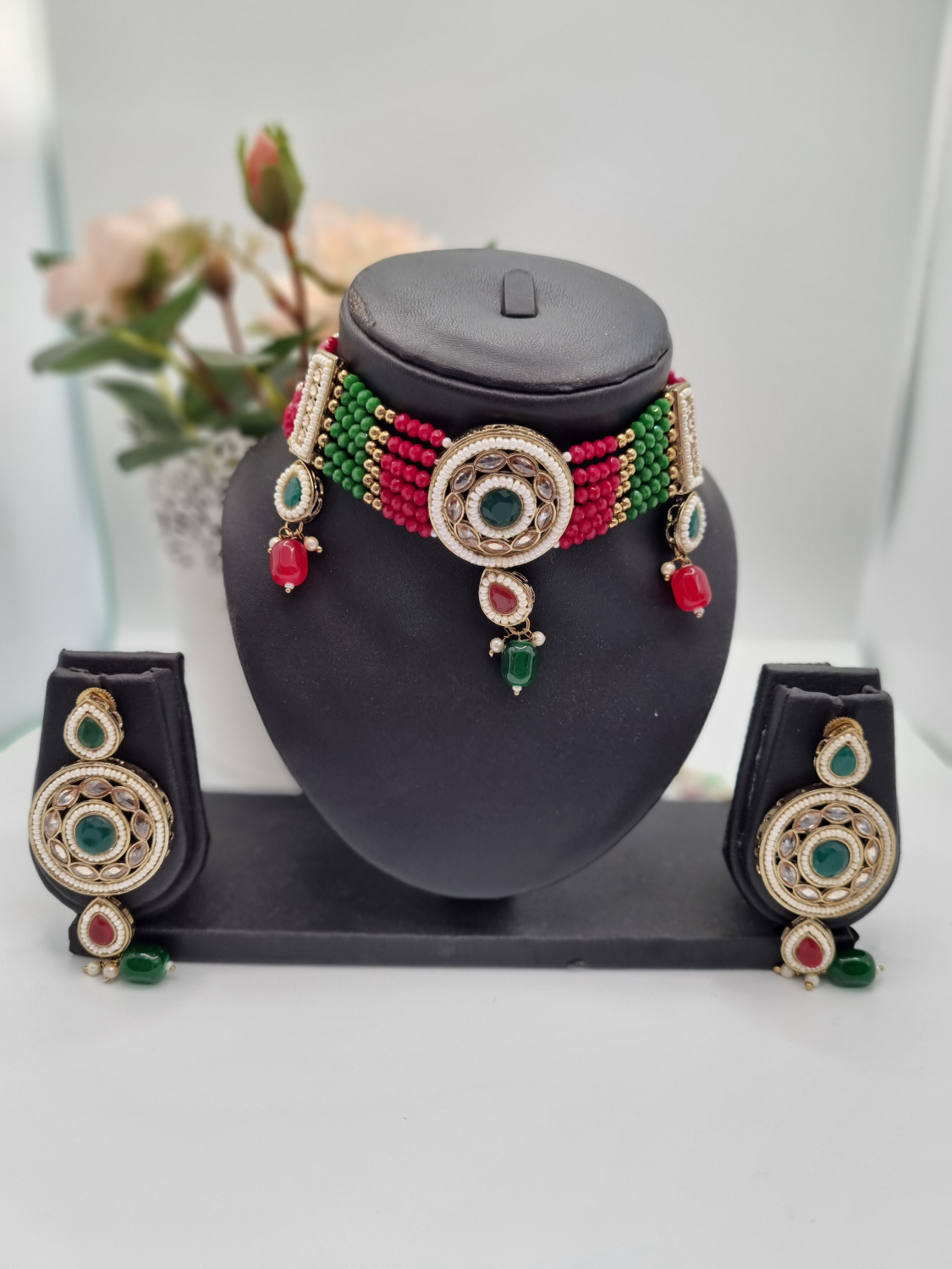 £17Green and red beads and pearls with kundan Stones